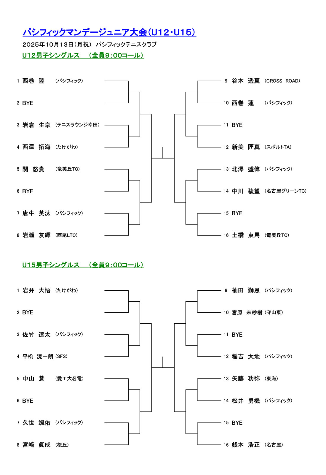 Home お知らせ パシフィックマンデージュニア大会(U12・U15)ドロー発表 パシフィックマンデージュニア大会(U12・U15)ドロー発表 2025.10.9 お知らせ Tweet Share ドローのダウンロードはこちら
