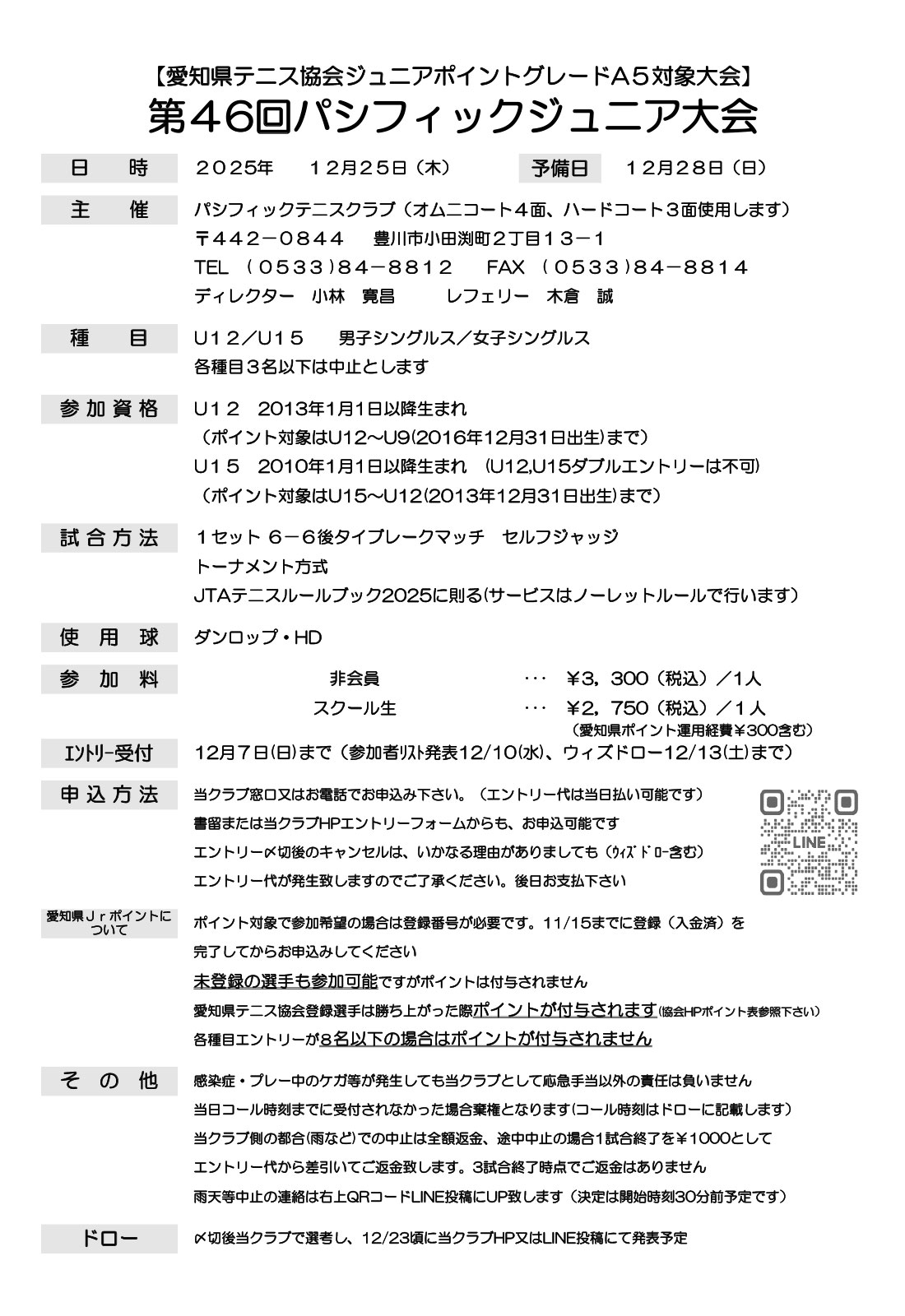 Home 大会エントリー 第46回パシフィックジュニア大会開催決定 第46回パシフィックジュニア大会開催決定 2025.11.10 大会エントリー Tweet Share ご参加の方は下記からエントリーをお願いします エントリーはこちら 大会概要はこちら