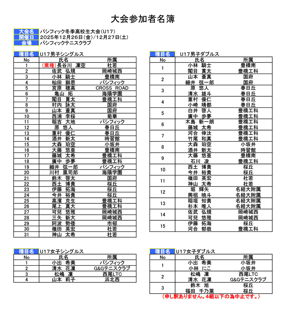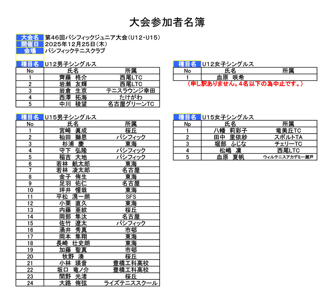 Home お知らせ 第46回ジュニア大会・冬季高校生大会参加者名簿発表 第46回ジュニア大会・冬季高校生大会参加者名簿発表 2025.12.10 お知らせ Tweet Share 名簿のダウンロードはこちら