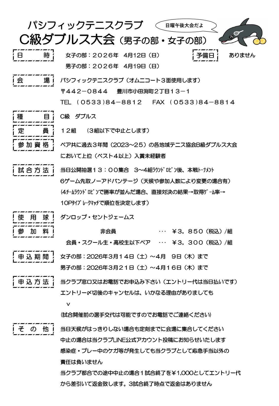 Home 大会エントリー C級ダブルス大会(男子の部・女子の部)開催決定 C級ダブルス大会(男子の部・女子の部)開催決定 2026.02.4 大会エントリー Tweet Share 申し訳ありませんが、エントリー方法は電話と窓口のみとさせていただきます。 男子は3月21日(土)~4月16日(木)、 女子は3月14日(土)~4月9日(木)となっておりますので、 そこから申込開始で先着順といたします。 ご迷惑をおかけして申し訳ありませんが、よろしくお願い致します。 この大会の概要はこちら