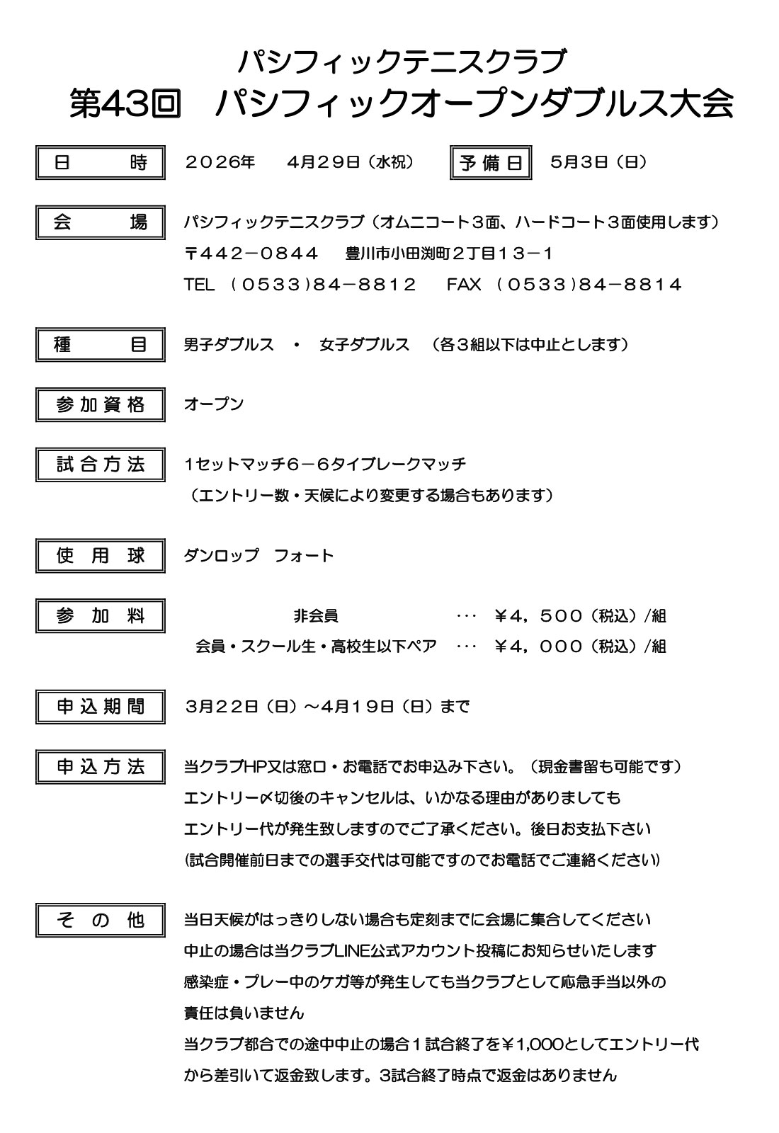 Home 大会エントリー 第43回パシフィックオープンダブルス大会開催決定 第43回パシフィックオープンダブルス大会開催決定 2026.02.4 大会エントリー Tweet Share ご参加の方は下記からエントリーをお願いします エントリーはこちら 大会概要はこちら