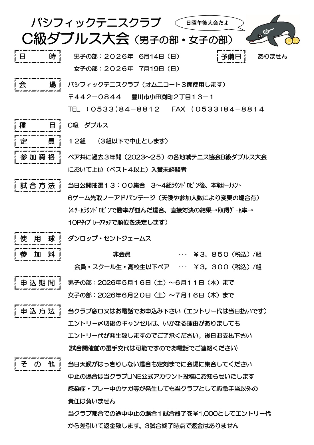 Home 大会エントリー C級ダブルス大会(男子の部・女子の部)開催決定 C級ダブルス大会(男子の部・女子の部)開催決定 2026.04.10 大会エントリー Tweet Share 申し訳ありませんが、エントリー方法は電話と窓口のみとさせていただきます。 男子は5月16日(土)~6月11日(木)、 女子は6月20日(土)~7月16日(木)となっておりますので、 そこから申込開始で先着順といたします。 ご迷惑をおかけして申し訳ありませんが、よろしくお願い致します。 この大会の概要はこちら