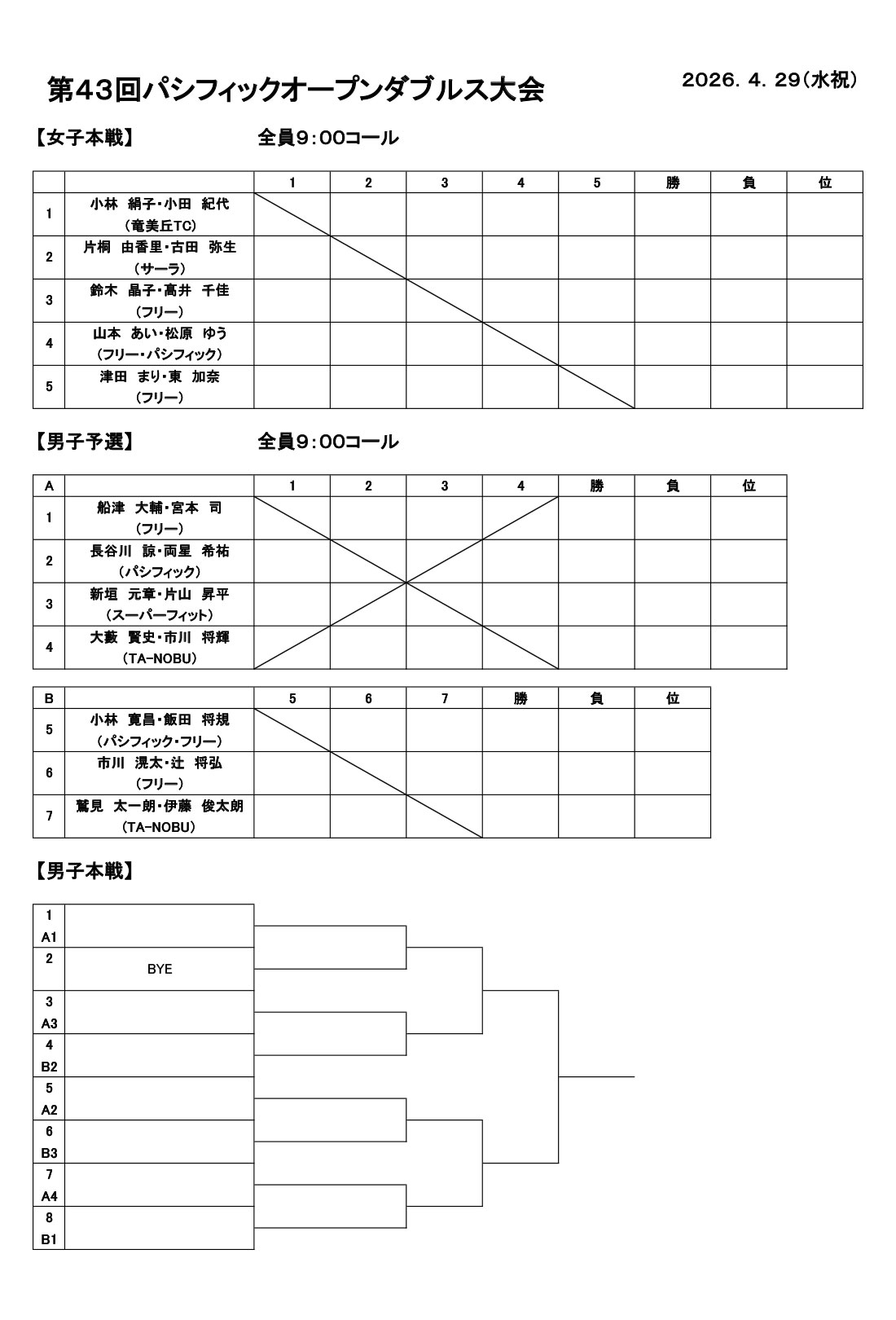 Home お知らせ 第43回パシフィックオープンダブルス大会ドロー発表 第43回パシフィックオープンダブルス大会ドロー発表 2026.04.24 お知らせ Tweet Share ドローのダウンロードはこちら